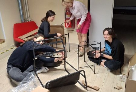 Veronika, Nikol in Žana so sestavljale pohištvo za nov družabni k...